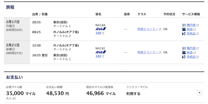 日本〜ハワイの往復に必要なANAマイル数が40,000マイルなので、カード決済だけでも毎年のようにハワイに行けることが分かります。